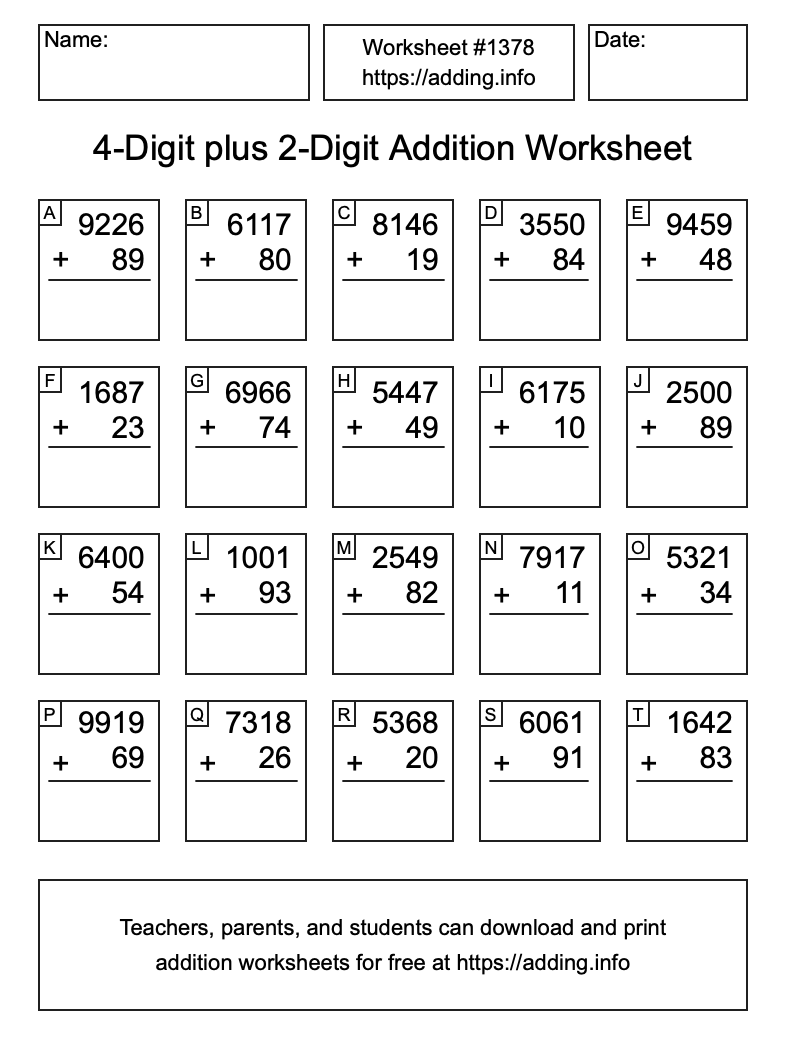 Here is the 4-Digit plus 2-Digit Addition Worksheet #1378. Print and/or save the worksheet using the buttons below the image. You can also drag or right-click on the image to download it to your device.