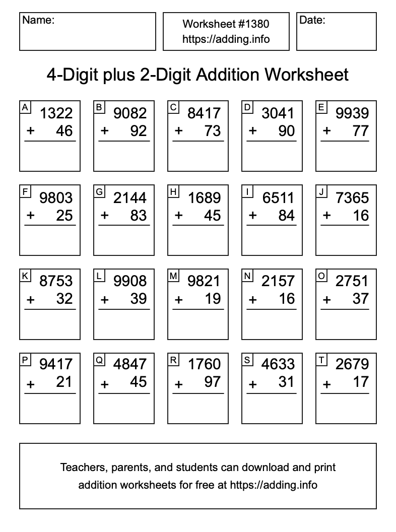 Here is the 4-Digit plus 2-Digit Addition Worksheet #1380. Print and/or save the worksheet using the buttons below the image. You can also drag or right-click on the image to download it to your device.