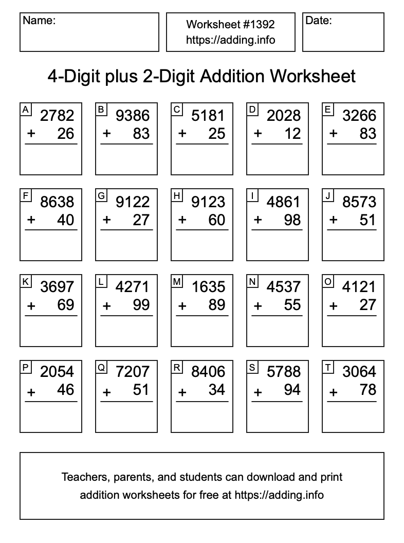 Here is the 4-Digit plus 2-Digit Addition Worksheet #1392. Print and/or save the worksheet using the buttons below the image. You can also drag or right-click on the image to download it to your device.