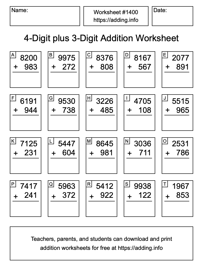 Here is the 4-Digit plus 3-Digit Addition Worksheet #1400. Print and/or save the worksheet using the buttons below the image. You can also drag or right-click on the image to download it to your device.