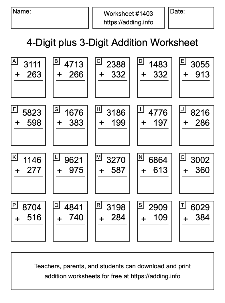 Here is the 4-Digit plus 3-Digit Addition Worksheet #1403. Print and/or save the worksheet using the buttons below the image. You can also drag or right-click on the image to download it to your device.