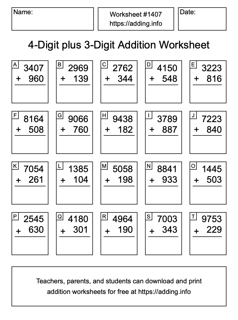 Here is the 4-Digit plus 3-Digit Addition Worksheet #1407. Print and/or save the worksheet using the buttons below the image. You can also drag or right-click on the image to download it to your device.