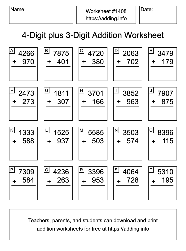 Here is the 4-Digit plus 3-Digit Addition Worksheet #1408. Print and/or save the worksheet using the buttons below the image. You can also drag or right-click on the image to download it to your device.