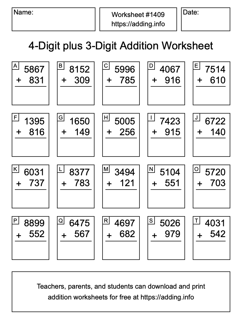 Here is the 4-Digit plus 3-Digit Addition Worksheet #1409. Print and/or save the worksheet using the buttons below the image. You can also drag or right-click on the image to download it to your device.