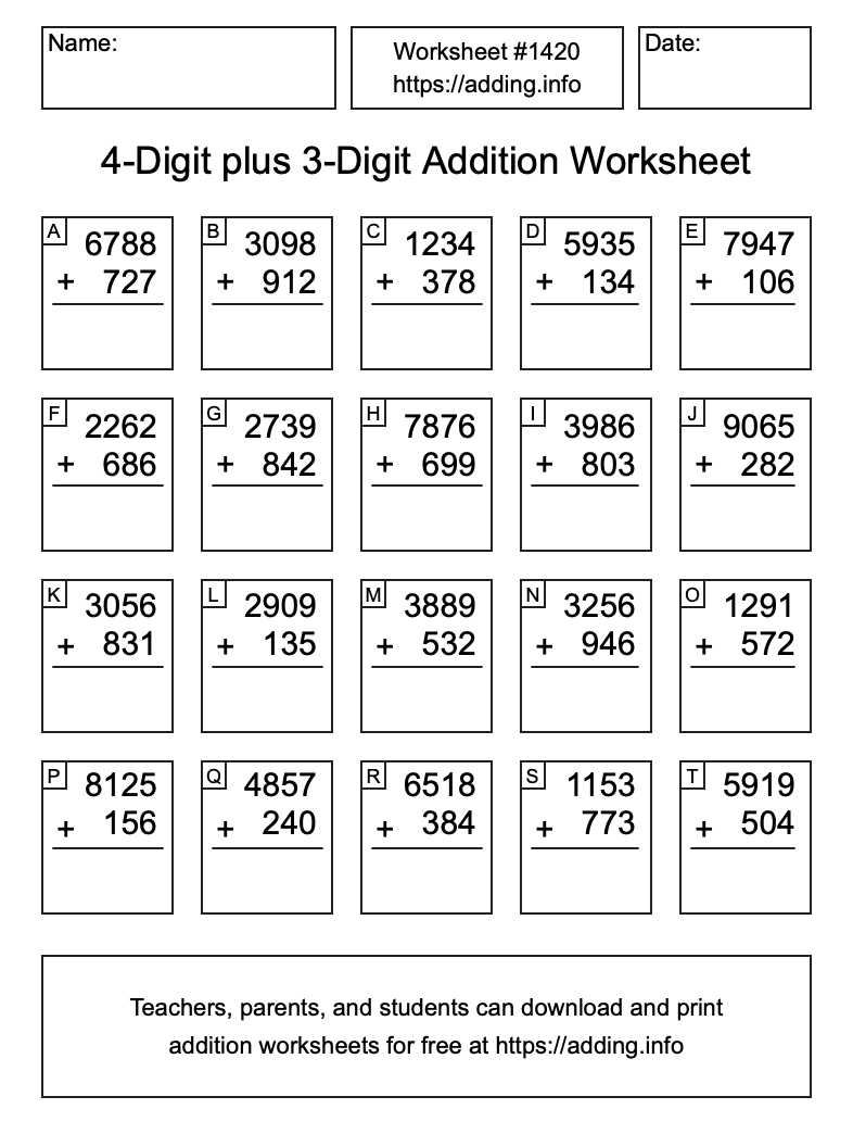 Here is the 4-Digit plus 3-Digit Addition Worksheet #1420. Print and/or save the worksheet using the buttons below the image. You can also drag or right-click on the image to download it to your device.