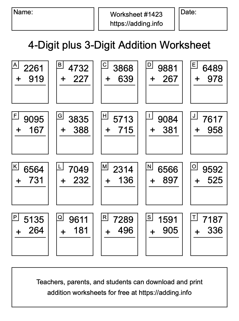 Here is the 4-Digit plus 3-Digit Addition Worksheet #1423. Print and/or save the worksheet using the buttons below the image. You can also drag or right-click on the image to download it to your device.