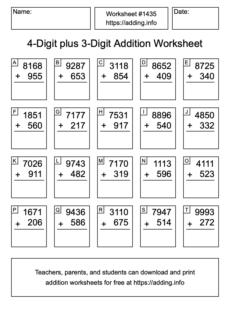 Here is the 4-Digit plus 3-Digit Addition Worksheet #1435. Print and/or save the worksheet using the buttons below the image. You can also drag or right-click on the image to download it to your device.