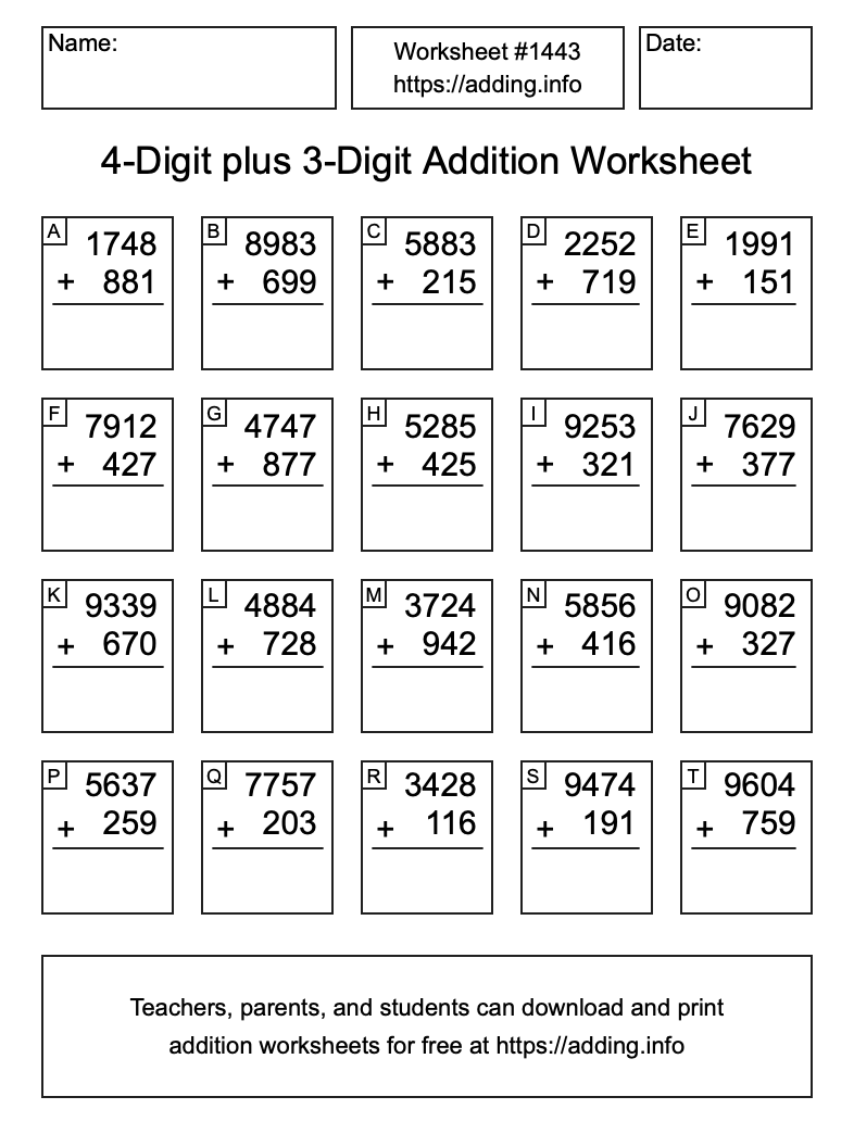 Here is the 4-Digit plus 3-Digit Addition Worksheet #1443. Print and/or save the worksheet using the buttons below the image. You can also drag or right-click on the image to download it to your device.