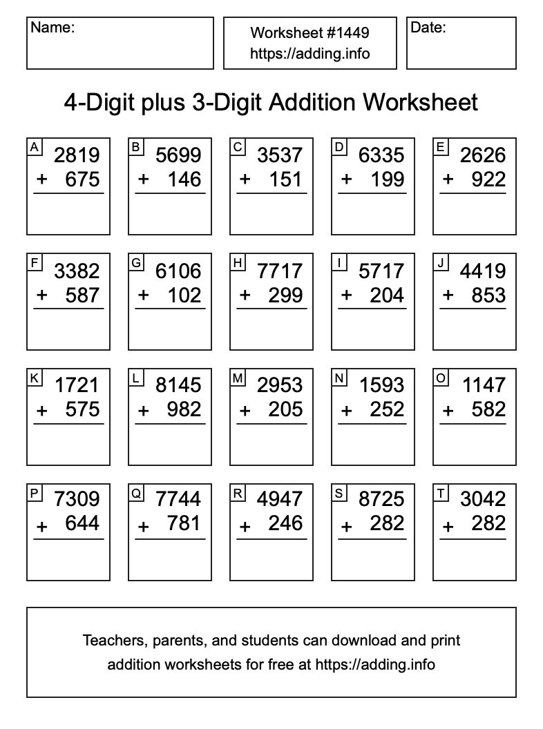 Here is the 4-Digit plus 3-Digit Addition Worksheet #1449. Print and/or save the worksheet using the buttons below the image. You can also drag or right-click on the image to download it to your device.