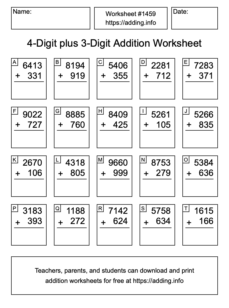 Here is the 4-Digit plus 3-Digit Addition Worksheet #1459. Print and/or save the worksheet using the buttons below the image. You can also drag or right-click on the image to download it to your device.