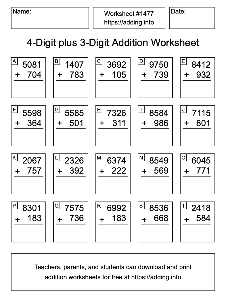 Here is the 4-Digit plus 3-Digit Addition Worksheet #1477. Print and/or save the worksheet using the buttons below the image. You can also drag or right-click on the image to download it to your device.