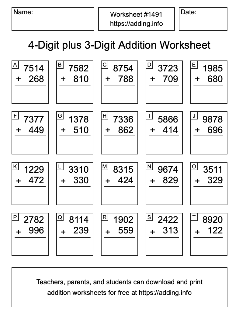 Here is the 4-Digit plus 3-Digit Addition Worksheet #1491. Print and/or save the worksheet using the buttons below the image. You can also drag or right-click on the image to download it to your device.