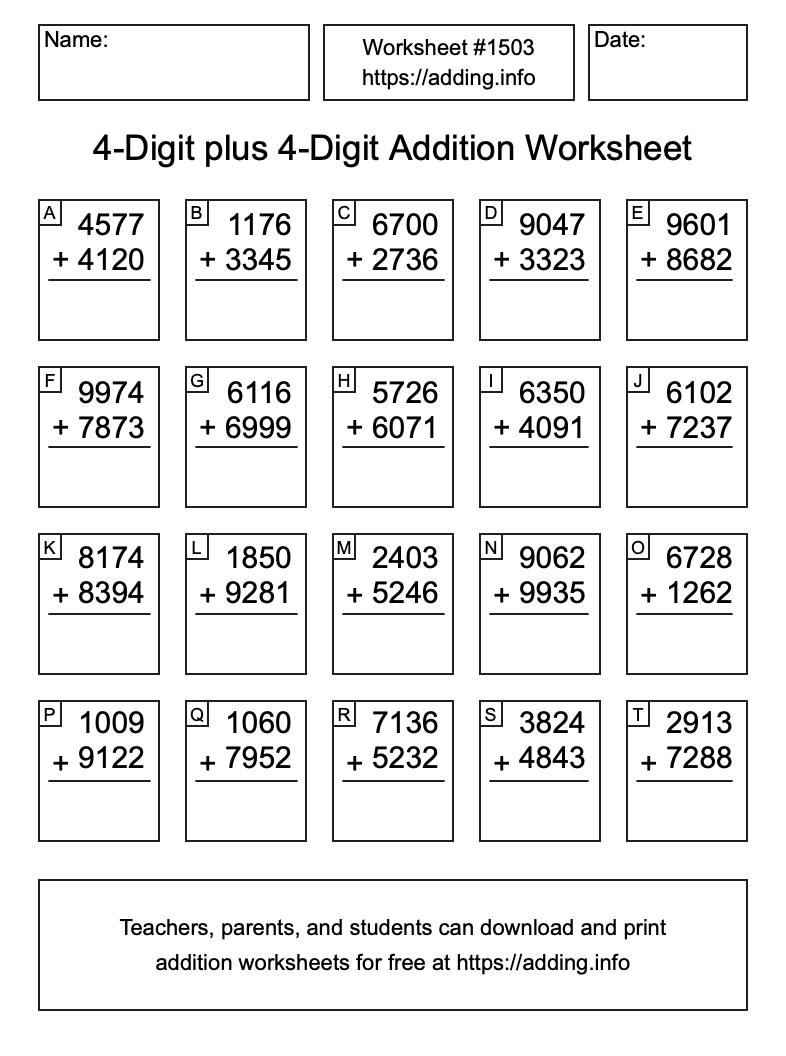 Here is the 4-Digit plus 4-Digit Addition Worksheet #1503. Print and/or save the worksheet using the buttons below the image. You can also drag or right-click on the image to download it to your device.