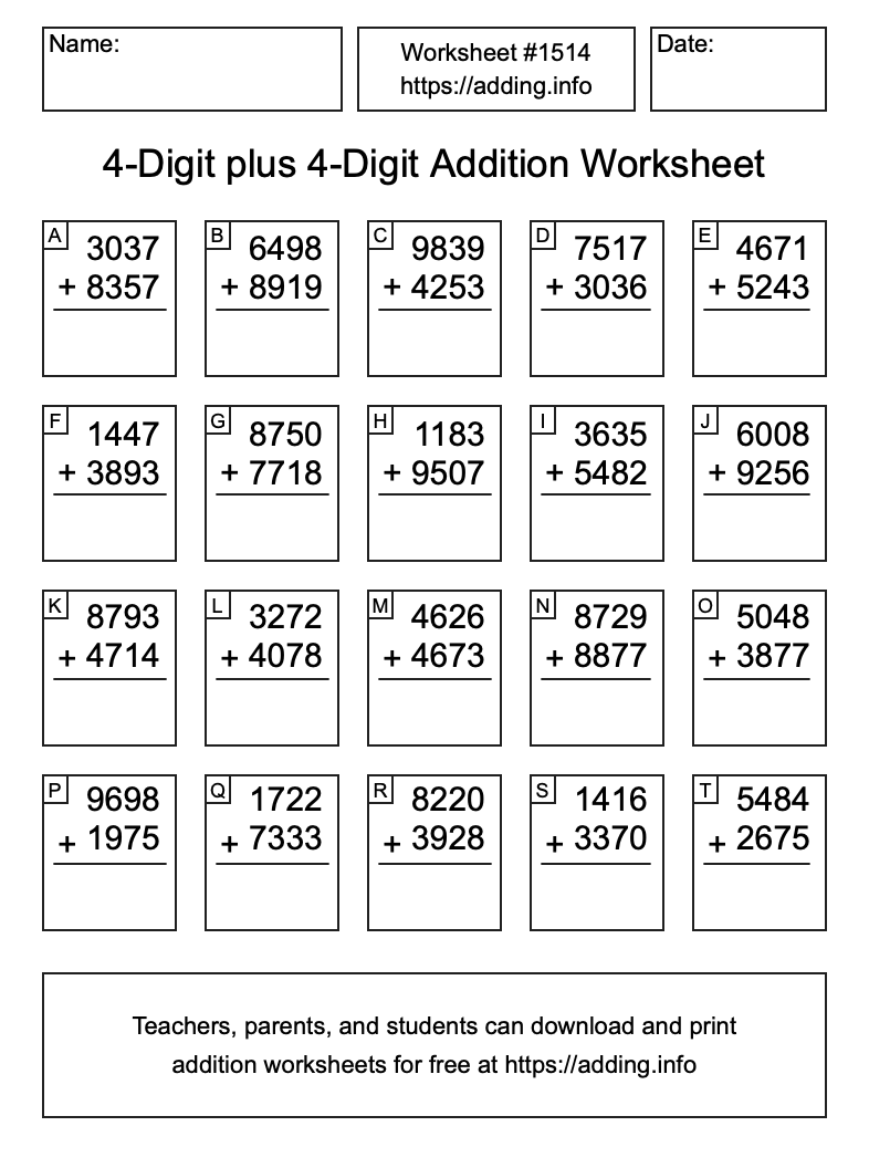 Here is the 4-Digit plus 4-Digit Addition Worksheet #1514. Print and/or save the worksheet using the buttons below the image. You can also drag or right-click on the image to download it to your device.