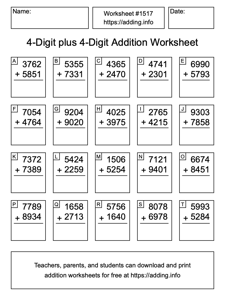 Here is the 4-Digit plus 4-Digit Addition Worksheet #1517. Print and/or save the worksheet using the buttons below the image. You can also drag or right-click on the image to download it to your device.