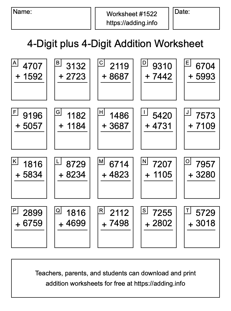 Here is the 4-Digit plus 4-Digit Addition Worksheet #1522. Print and/or save the worksheet using the buttons below the image. You can also drag or right-click on the image to download it to your device.